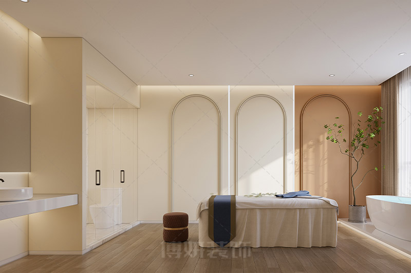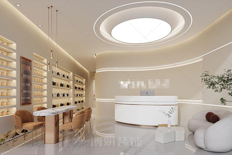 整體采用女性偏好風(fēng)格進(jìn)行裝修,顏色方面運(yùn)用莫蘭迪色系,讓彩色中多了幾分恬靜溫柔,變得更加具有親和力。同時,莫蘭迪色系又是質(zhì)感,氛圍感都比較強(qiáng)烈的顏色,具有高級感。前臺的異形弧面設(shè)計又體現(xiàn)了女性的柔和之美,燈帶的加持更好的烘托了氛圍。
